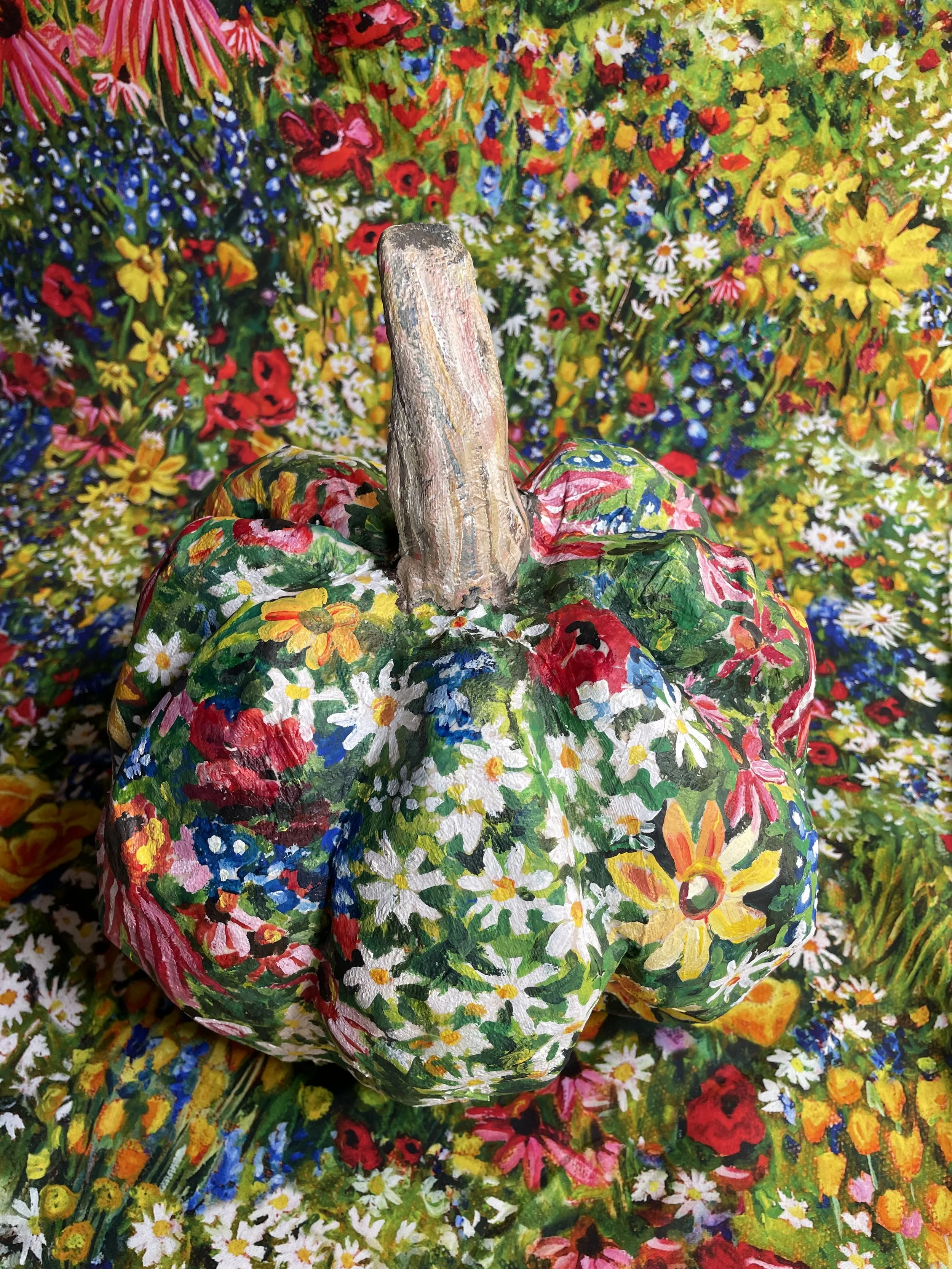 I don’t know why I’m so obsessed with painting pumpkins but I think it’s so interesting to see a painting curving around the organic shape and the stem breaks the fourth wall. I’ve painted pumpkins for several years now and last year I was particularly attached to my Field of Flowers Textile pumpkin and it was sad to see it rot. I wanted to make one this year that would last forever, so I paper mached a pumpkin to paint. I’m so thrilled that I’ll be able to enjoy it year after year! And hopefully I will make a new one each year to build a collection!