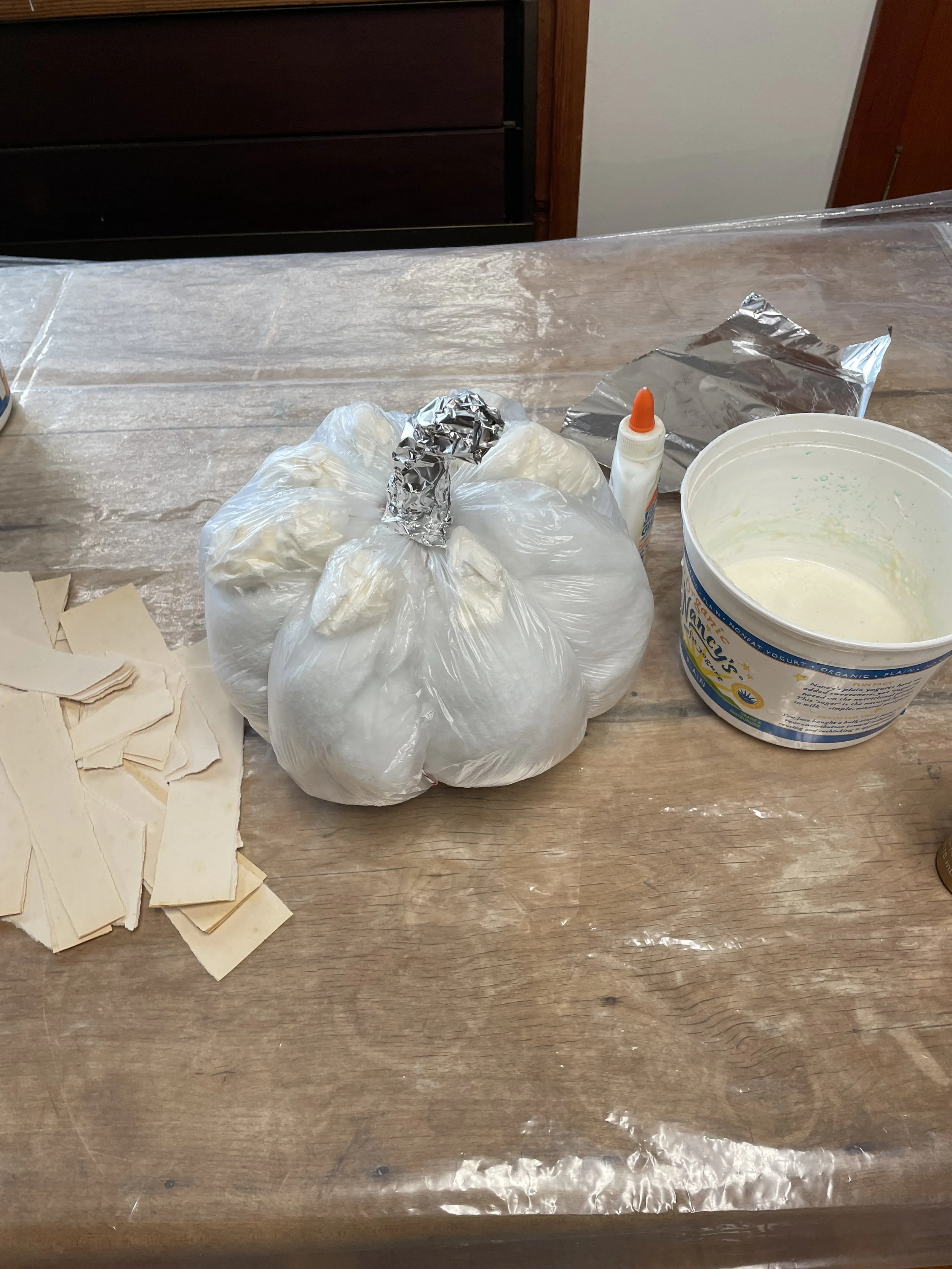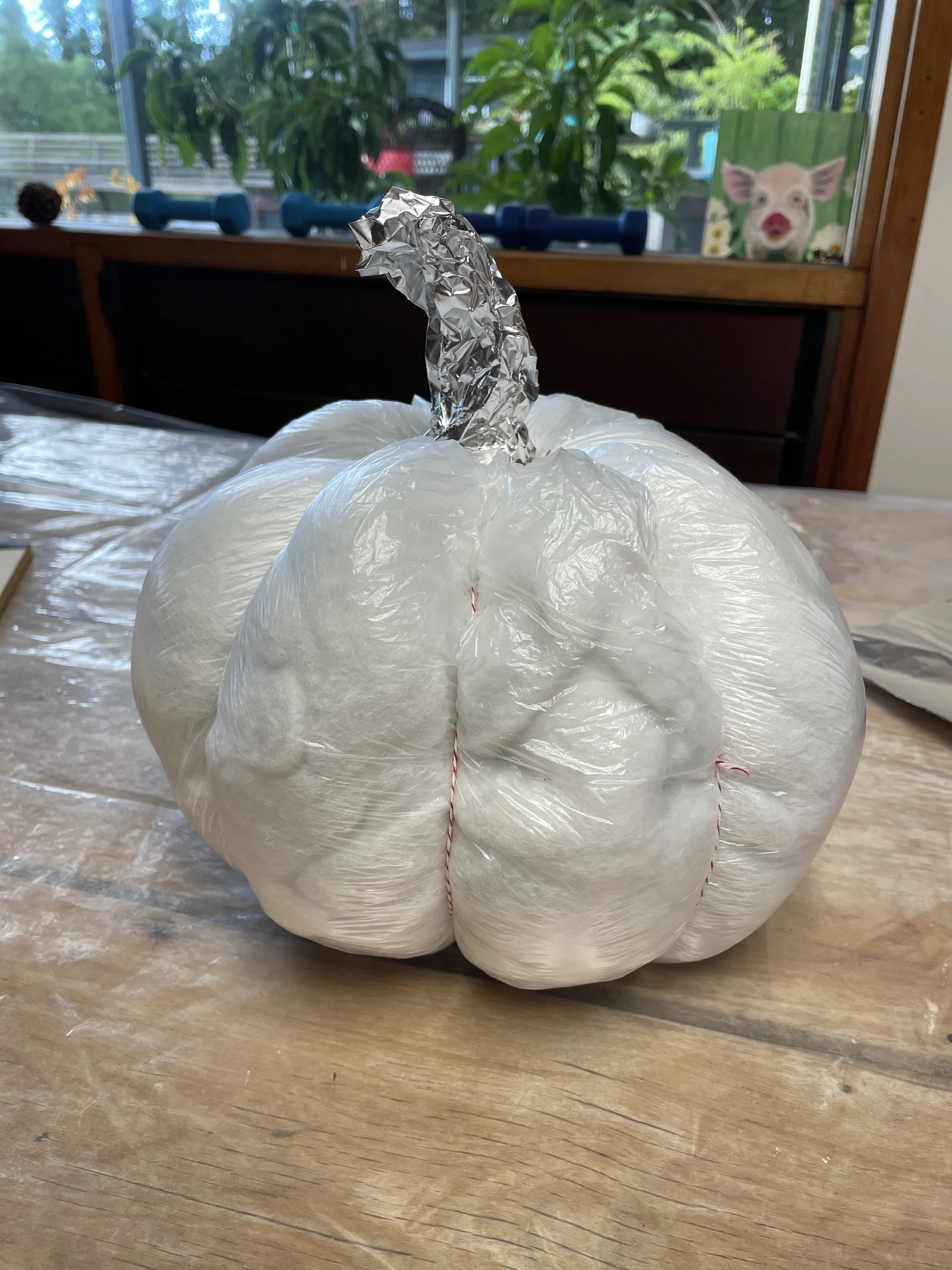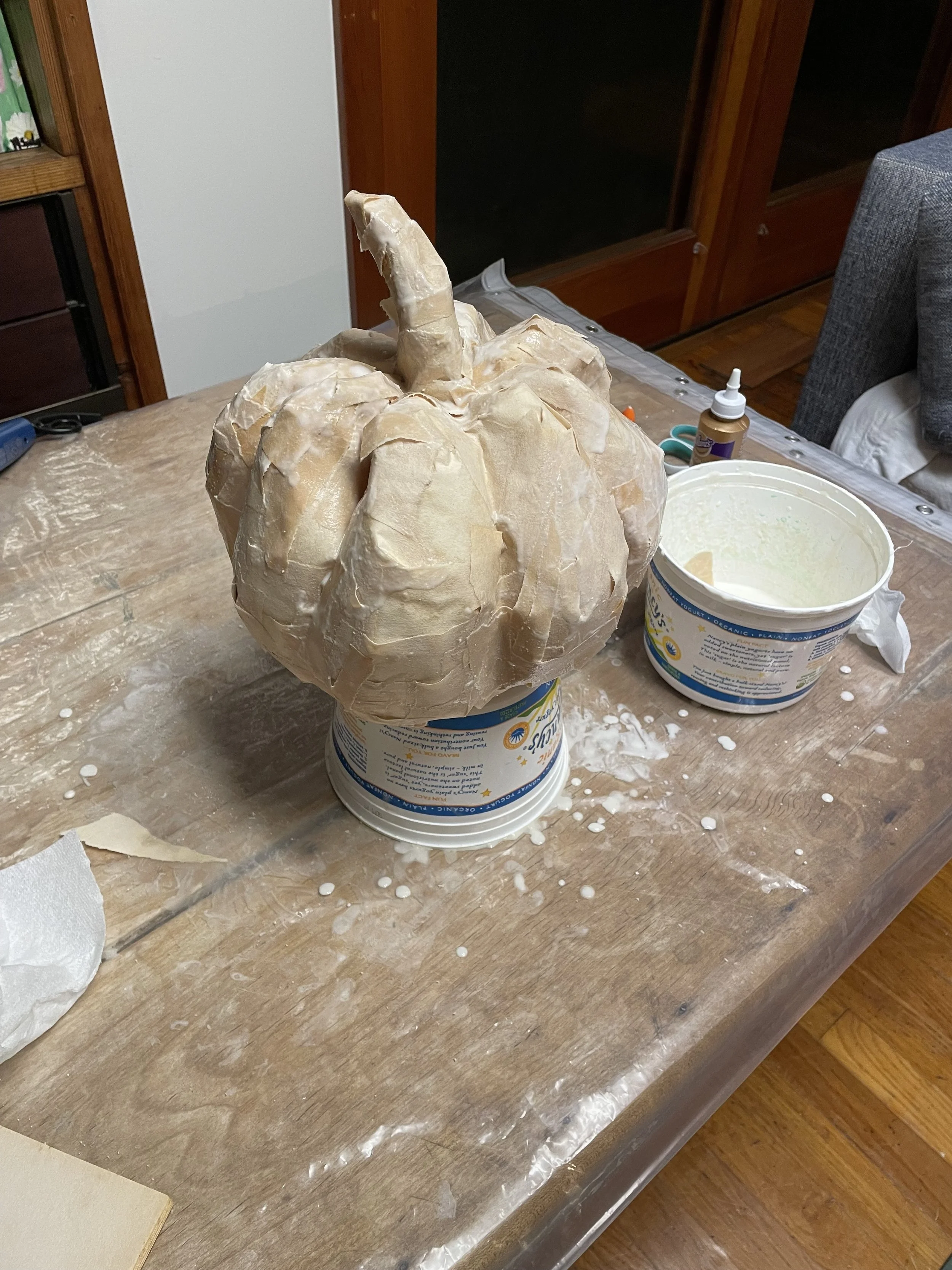 7) I don’t have detailed pictures of this step, but before fully covering the pumpkin bottom, I snipped the strings and the plastic bag at the base and pulled out the pillow stuffing so the pumpkin is hollow. (This is not necessary but I wanted it dry from the inside and be lighter.) Then I paper mached the bottom with a few layers or newsprint and paper towel on top. I used a lot of hot blowdrying to speed up dry time and keep it from collapsing.
