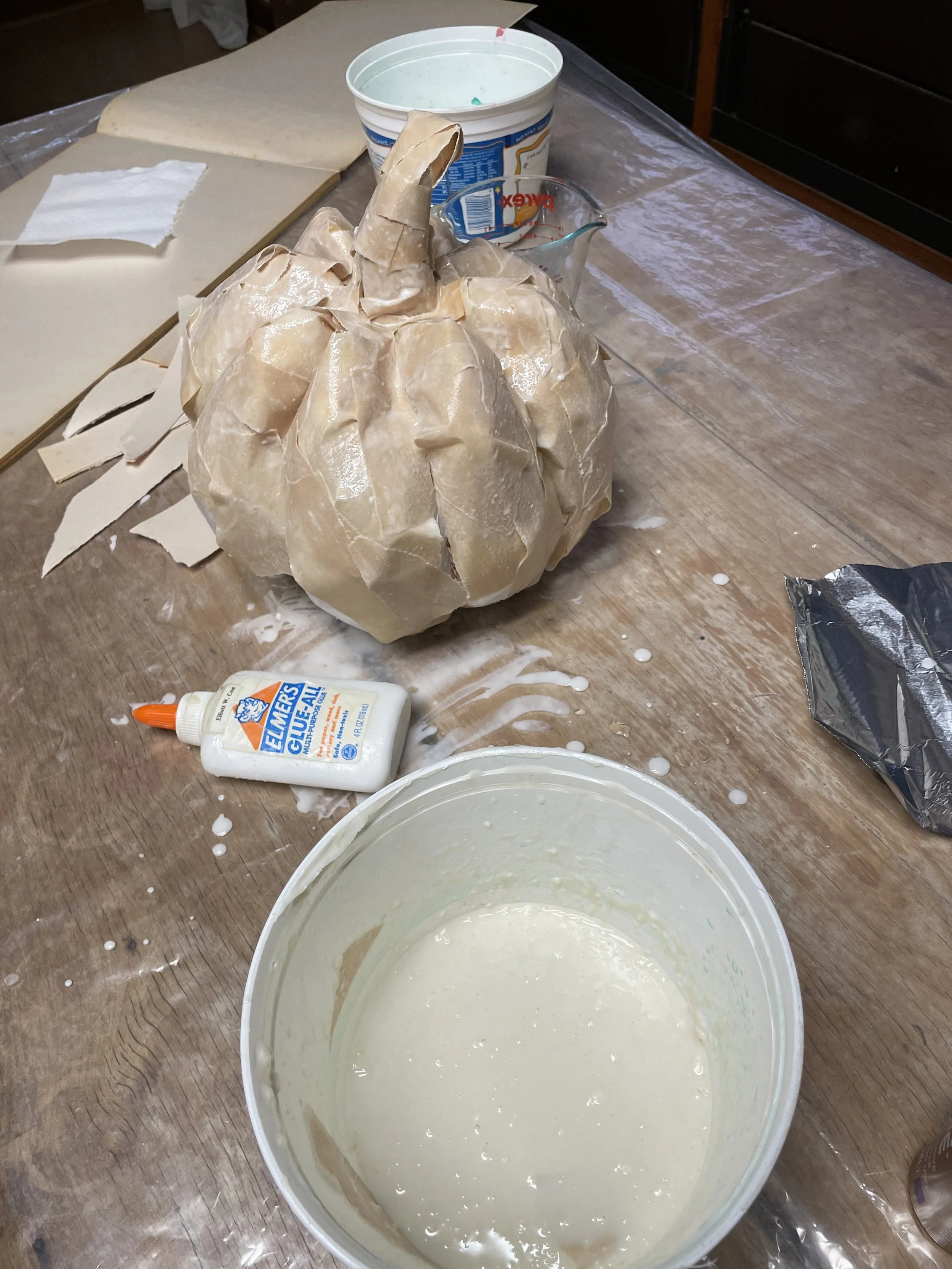 4) Prepared the paper mache paste and paper strips. For the paste, I mixed hot water, glue, white flour and a bit of salt. I used torn newsprint for the first two layers of paper mache. Layer one was rough but built a foundation.