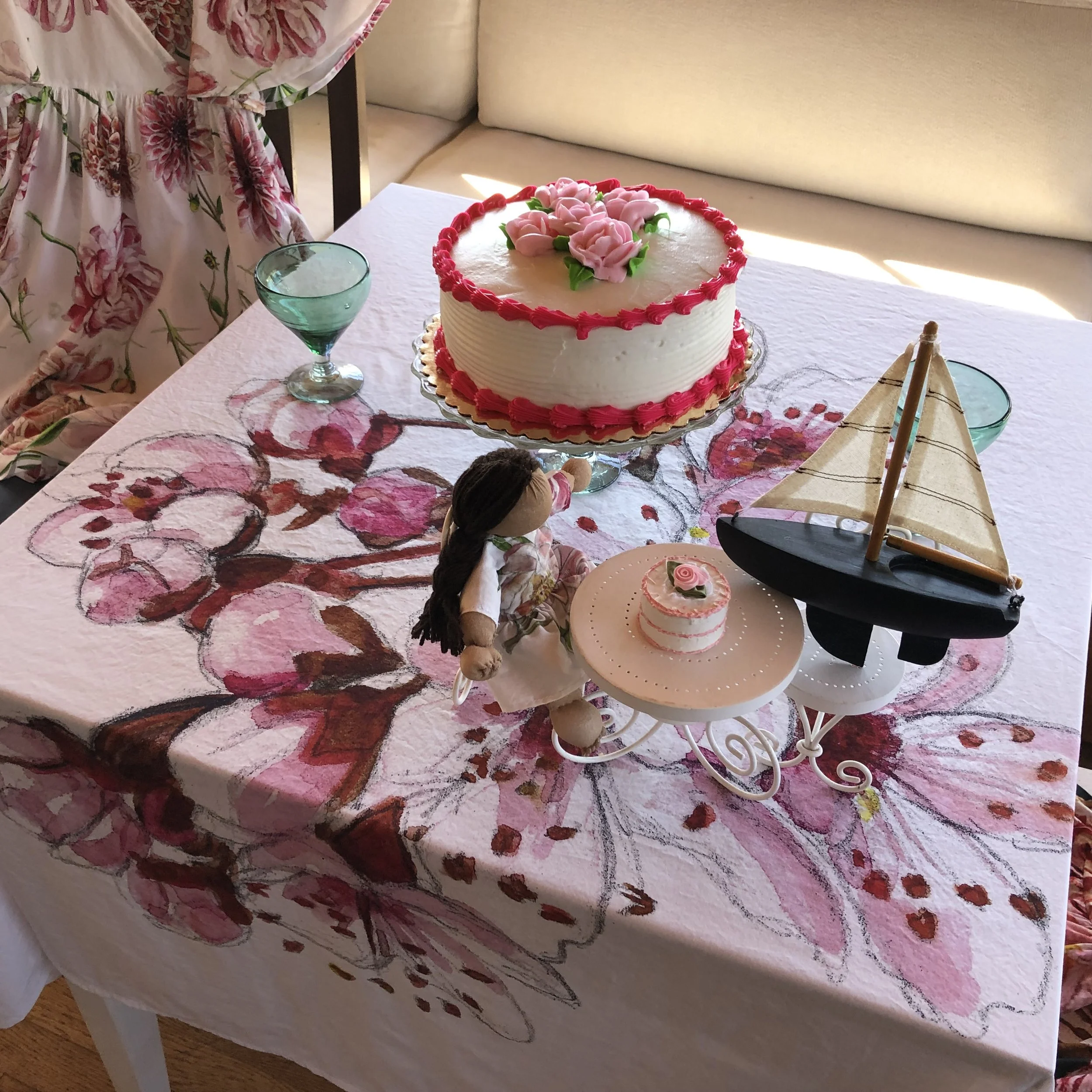 One day in January of 2022, while I was halfway through the paintings for the book, I woke up with a vision for a final party scene that would end the book on a celebratory note, and allow for the possibility of reading the book as a story play-acted with a toy doll and boat. By 2022, I had established my fabric business and also wanted to have my models wearing my fabrics at the end of the book. Worried about the kids having grown, I rapidly sewed new dresses for them with my Blush and Pink Bouquet Jubilee fabrics and the Bebekins Tilly Dress pattern, and hemmed a table cloth with my XL Cherry Giant Flower Panel. Then I sanded and repainted my brother’s childhood tiny toy boat (and sewed a new sail for it) to be a replica of the big boat. I also crafted a tiny cake with a lid coated in white paint and iced with pink puffy paint, topped with a ribbon rose. The day before the photoshoot, I made lei po’o (head lei) for Tehya and Kaia and picked up a cake I ordered from Safeway to match the tiny cake. I got out my mom’s light green glassware and filled cups with cherries, blackberries and strawberries. My neighbor, Karen Thompson, let me borrow her gorgeous cake stand. Finally, I moved a lot of potted flowers into the room where I would stage the scene. When the girls showed up the next day, it was like entering a fairytale. Both girls were elated to be in this magical scene eating strawberries and playing with the toy boat and doll. The girls and their families enjoyed the cake after our final photoshoot.