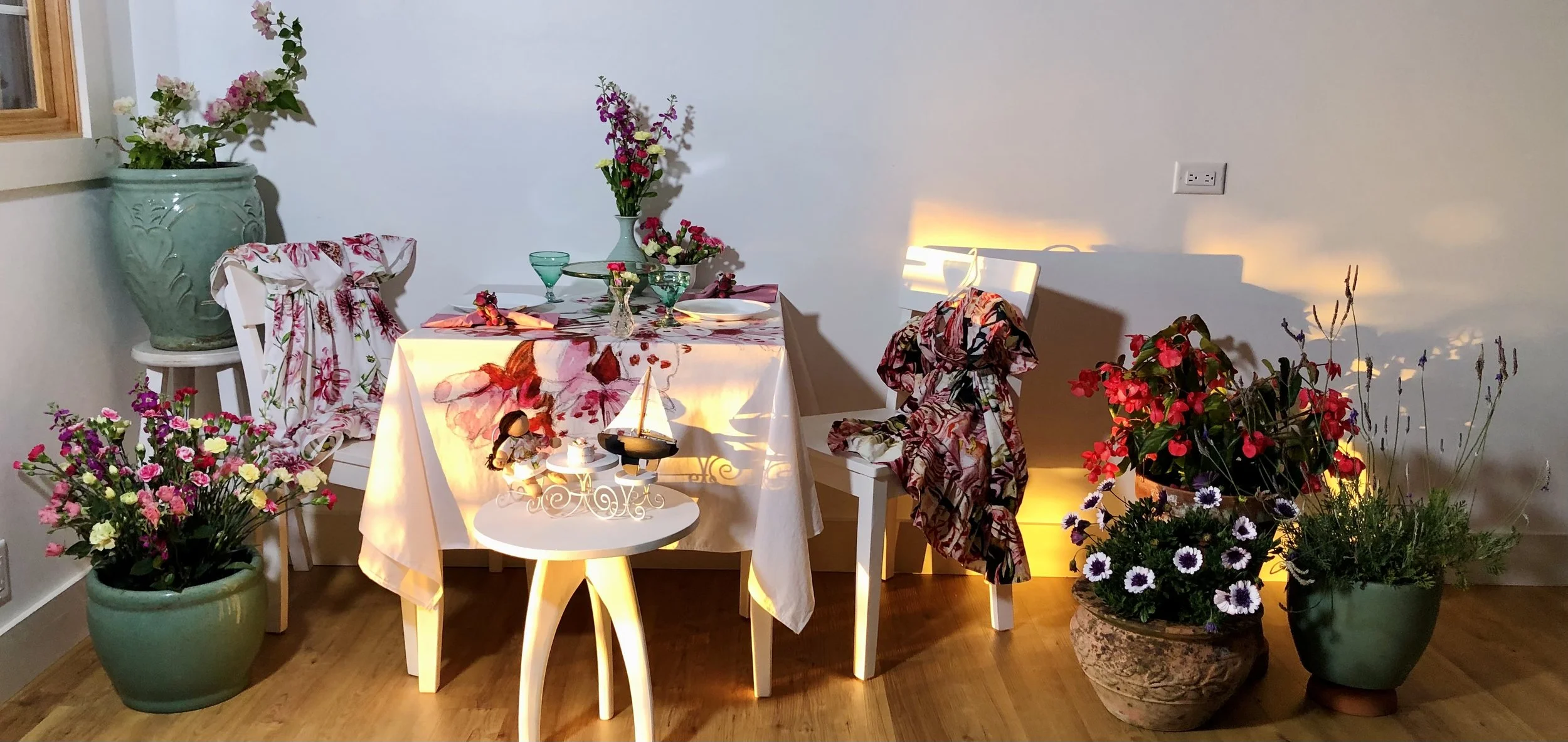 The party scene contains 3 of my fabrics. Blush Watercolor Textile, Pink Bouquet Jubilee and the Giant Cherry Blossom Panel as the tablecloth!